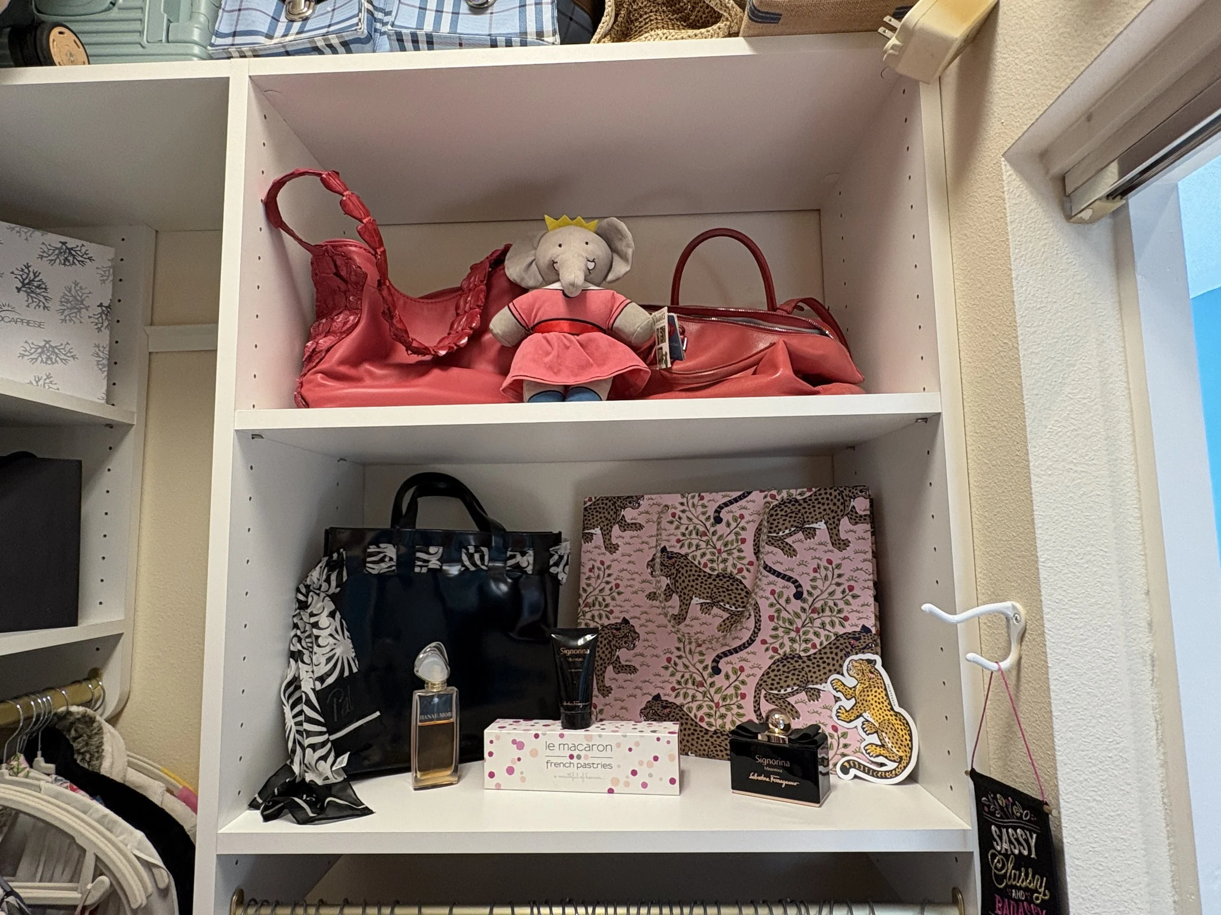 We unboxed her shoes, starting with her flats, and adjusted shelving so all flats could live together in one dedicated section. We created three display shelves featuring purses, boxes, and accessories, turning storage into something beautiful and intentional.