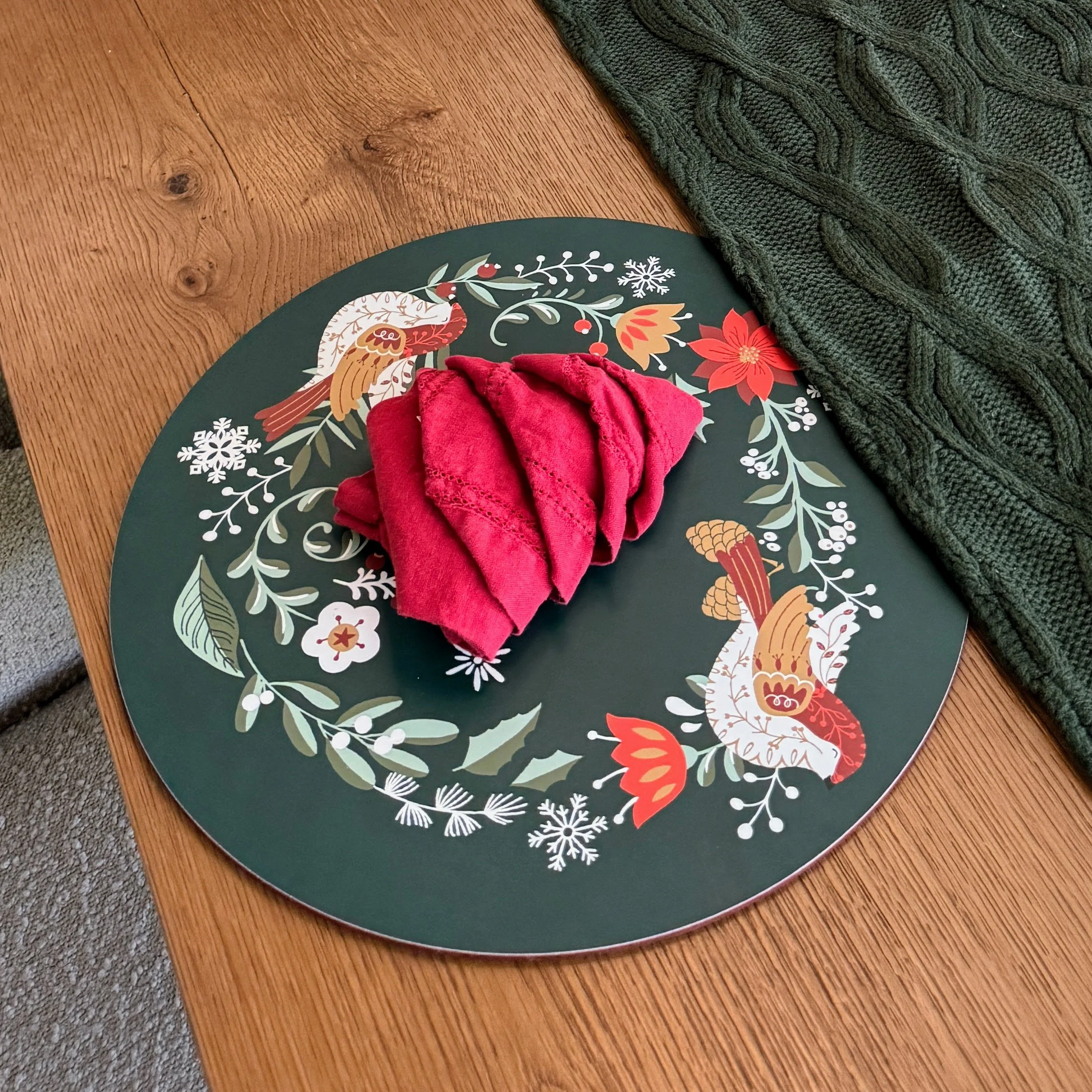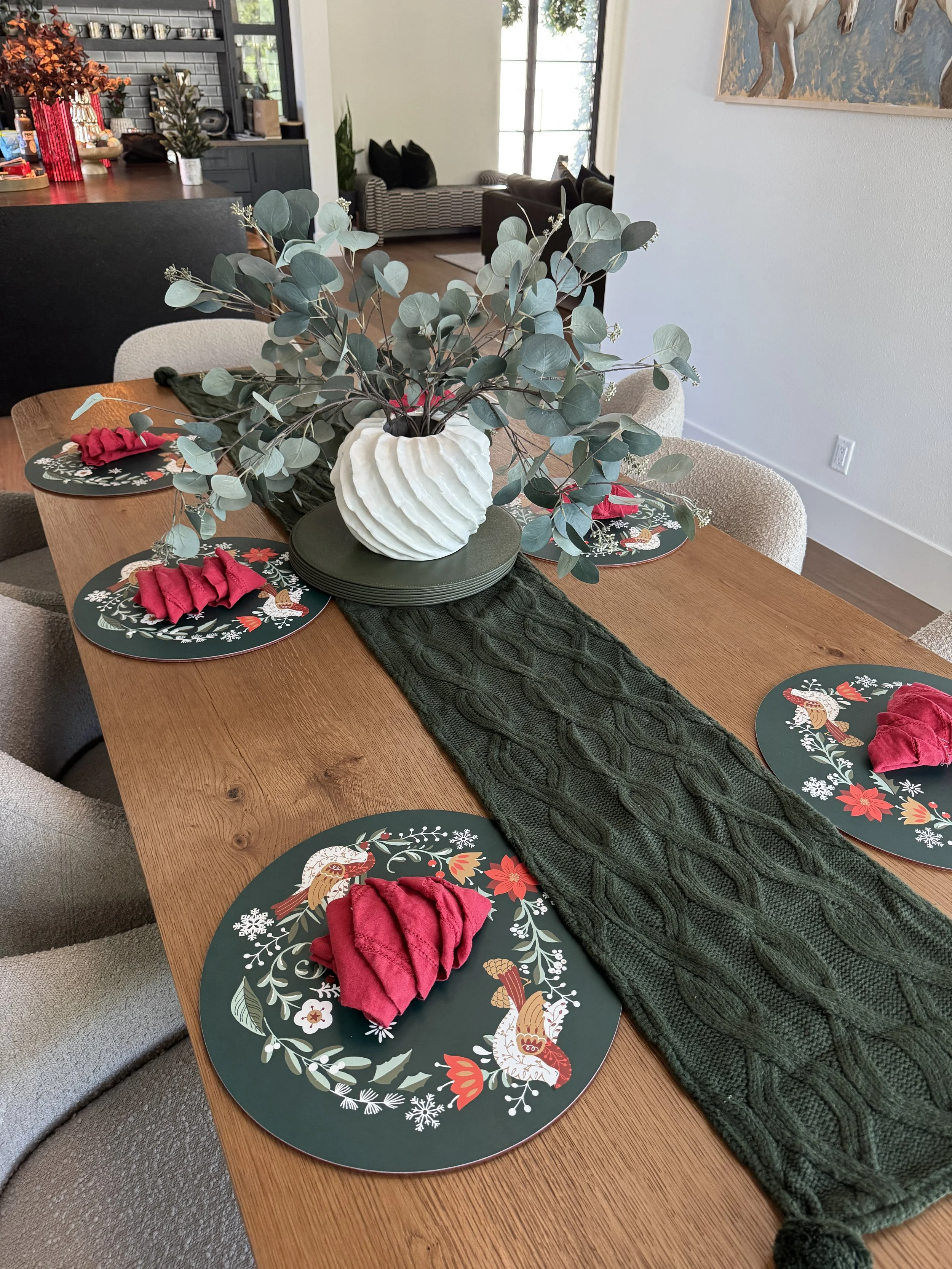 ✨ Created a festive tablescape in the dining room — complete with seasonally layered placemats and Christmas-tree-folded napkins