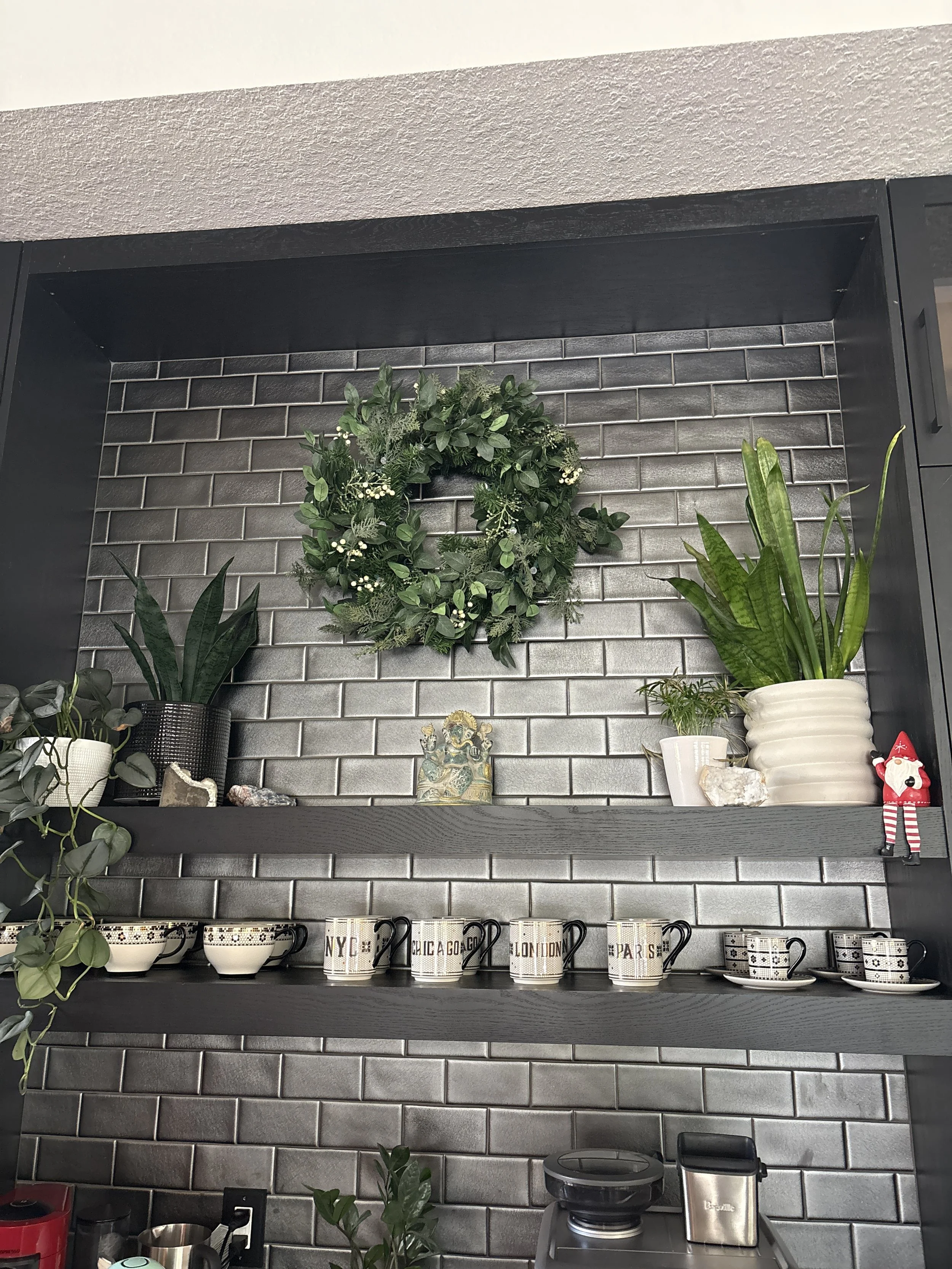 ✨ Styled the coffee bar and kitchen island with greenery and simple luxe accents