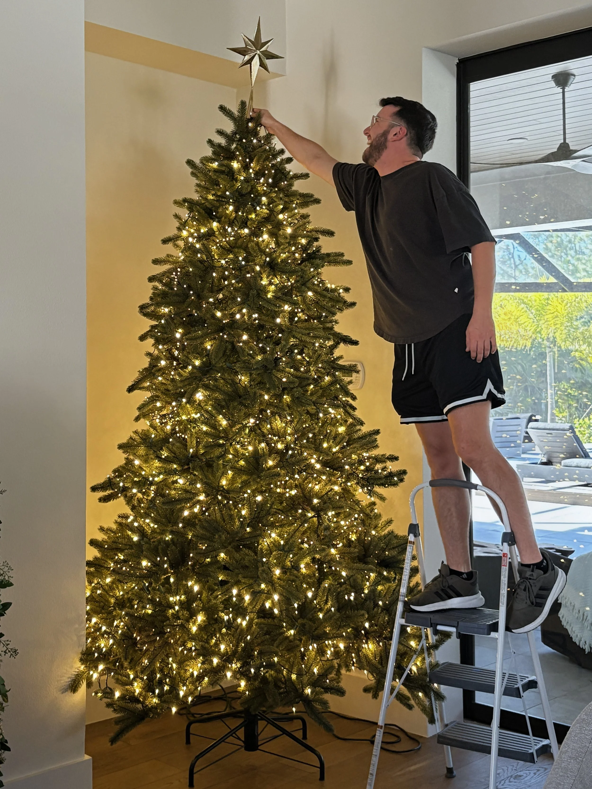 To begin, we focused on the centerpiece of any holiday home — the tree. Knowing Kathy loves soft, glowing ambiance, we carefully tested and layered 15 strands of perfectly curated lights in both warm-white and soft LED tones. The result was a luxurious, golden glow that illuminated the entire room.